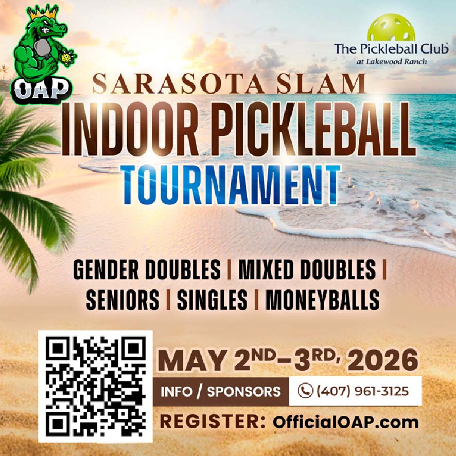 ➡️ "OAP Sarasota Slam Tournament" Pickleball tournament in Sarasota, FL May 2-3, 2026 https://floridapickleballtournaments.com/event/oap-sarasota-slam-tournament/